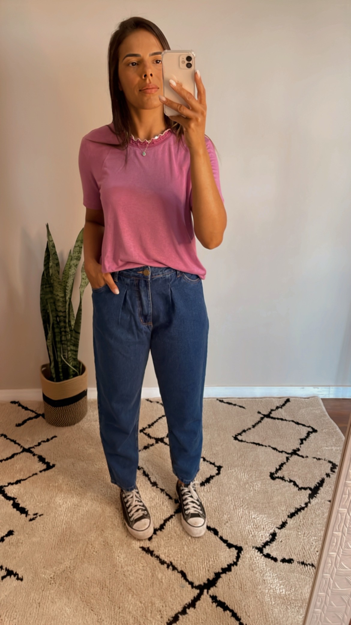 Blusa manga curta com detalhe na gola. Malha super macia e o detalhe da gola não pinica além dá um charme para uma peça básica que todo mundo usa.