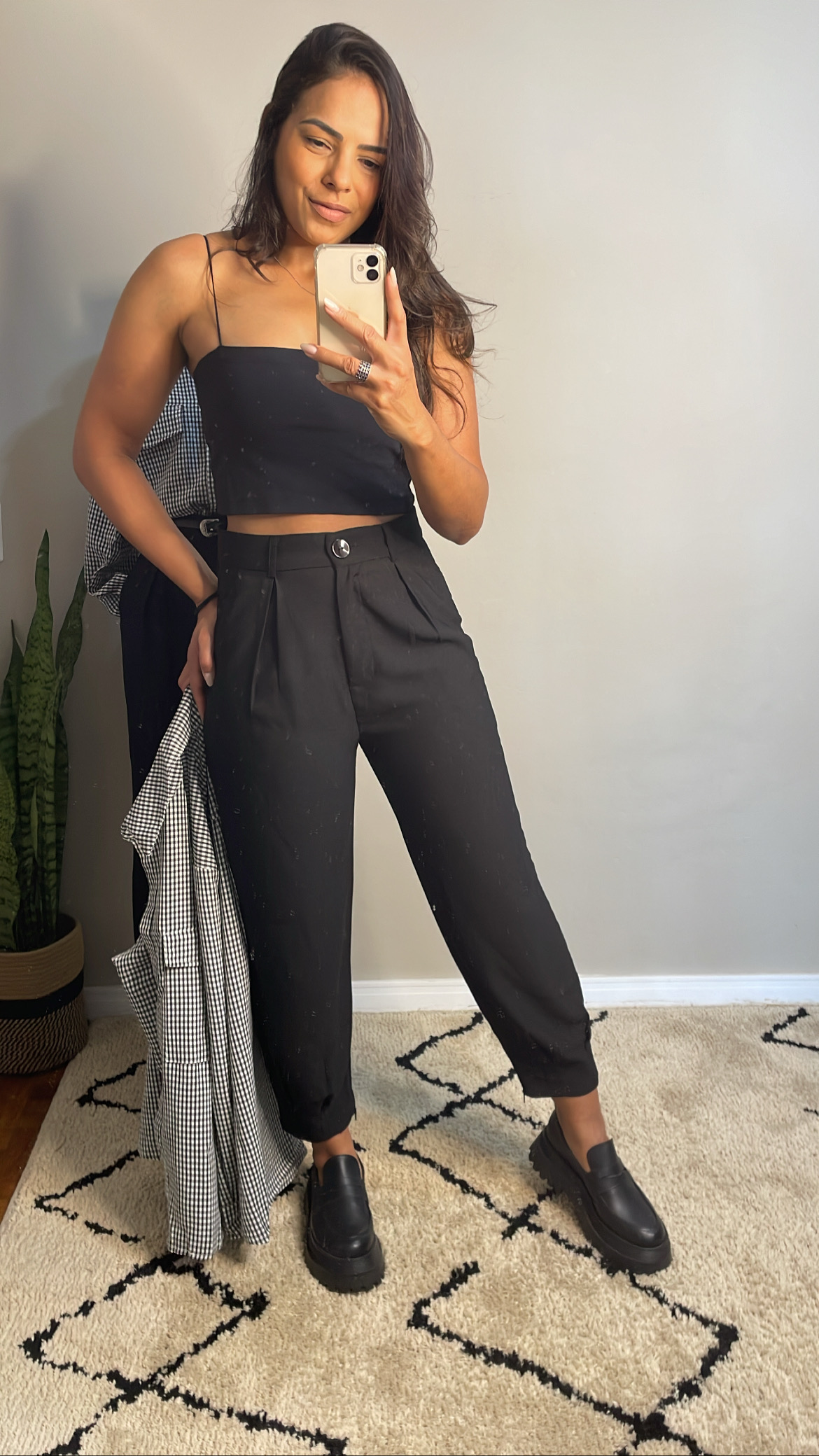 Calça em crepe modelo cenoura, possui bolso faca e bolsos atrás, passante para cinto, zíper na barra. Fechamento frontal por zíper e botões.