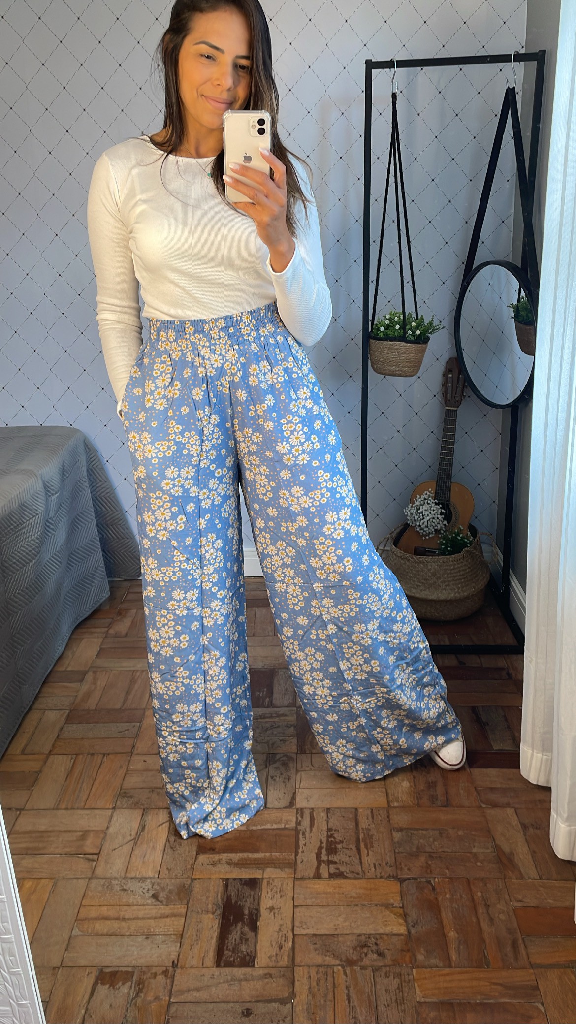 Calça em viscose com forro, elástico na cintura, possui bolsos.