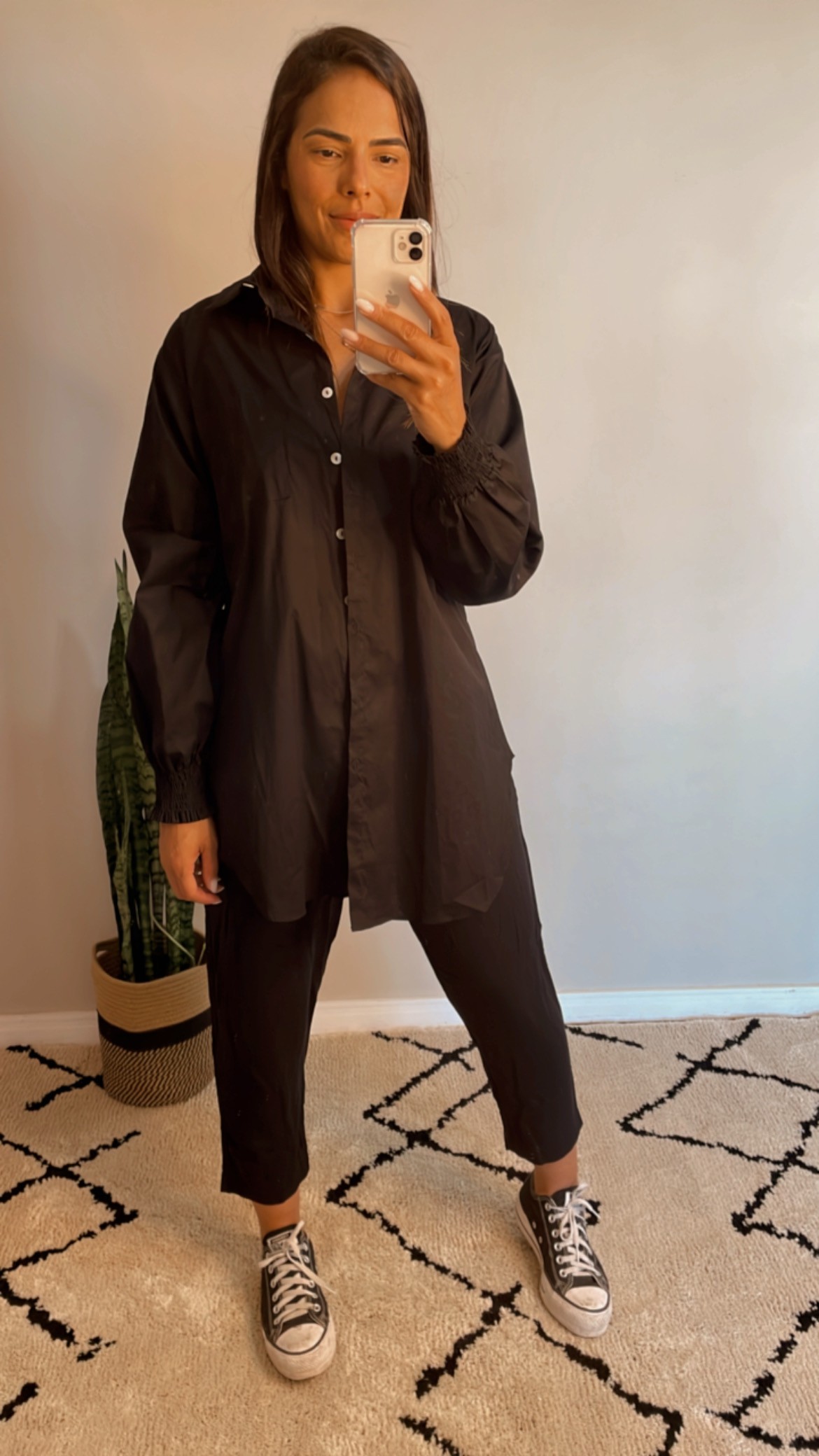 Camisa em tricoline que é um tecido mais encorpado. Tem elástico nos punhos.