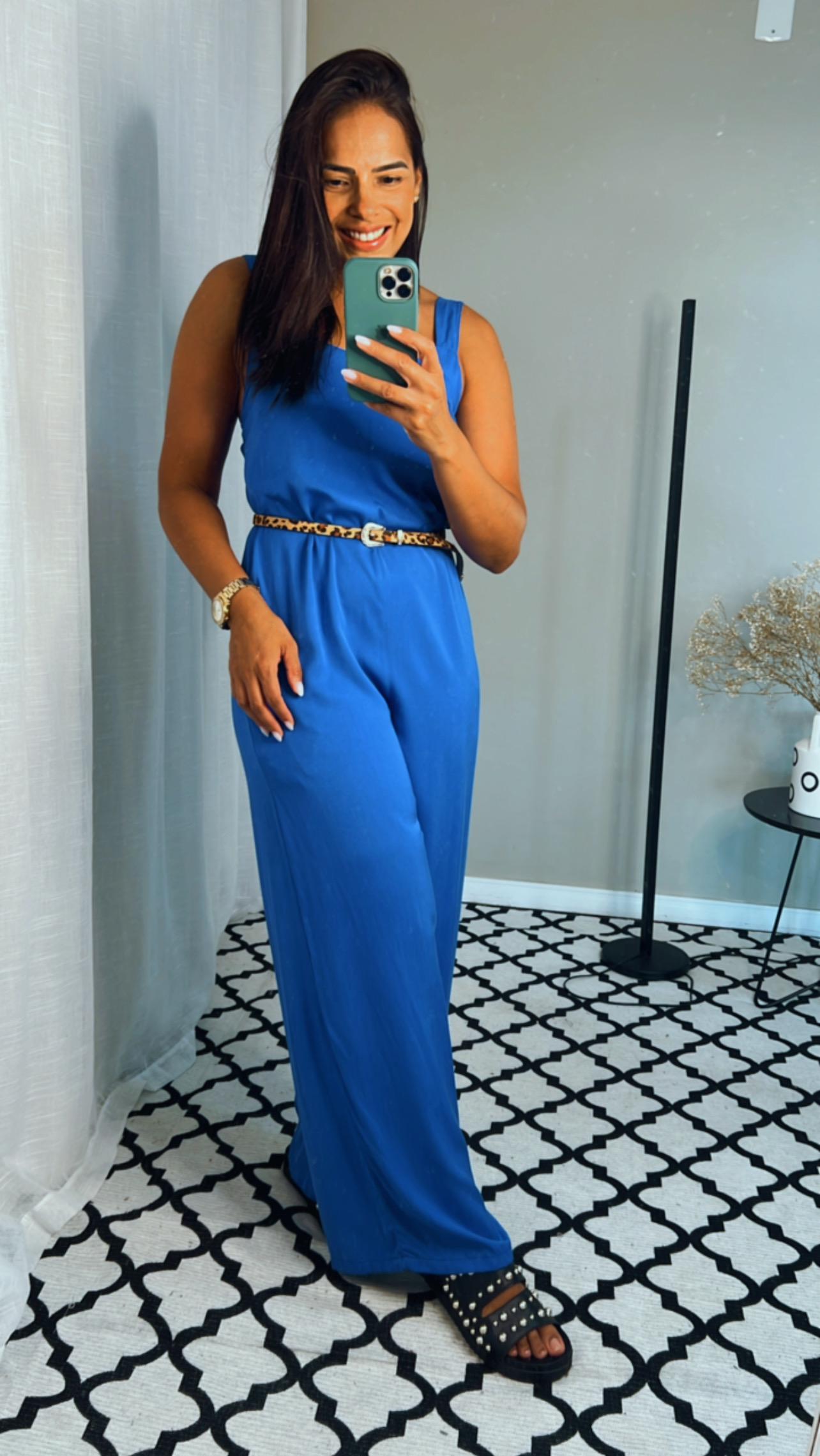 Macacão e viscolinho, com bolsos faca, elástico nas costas.