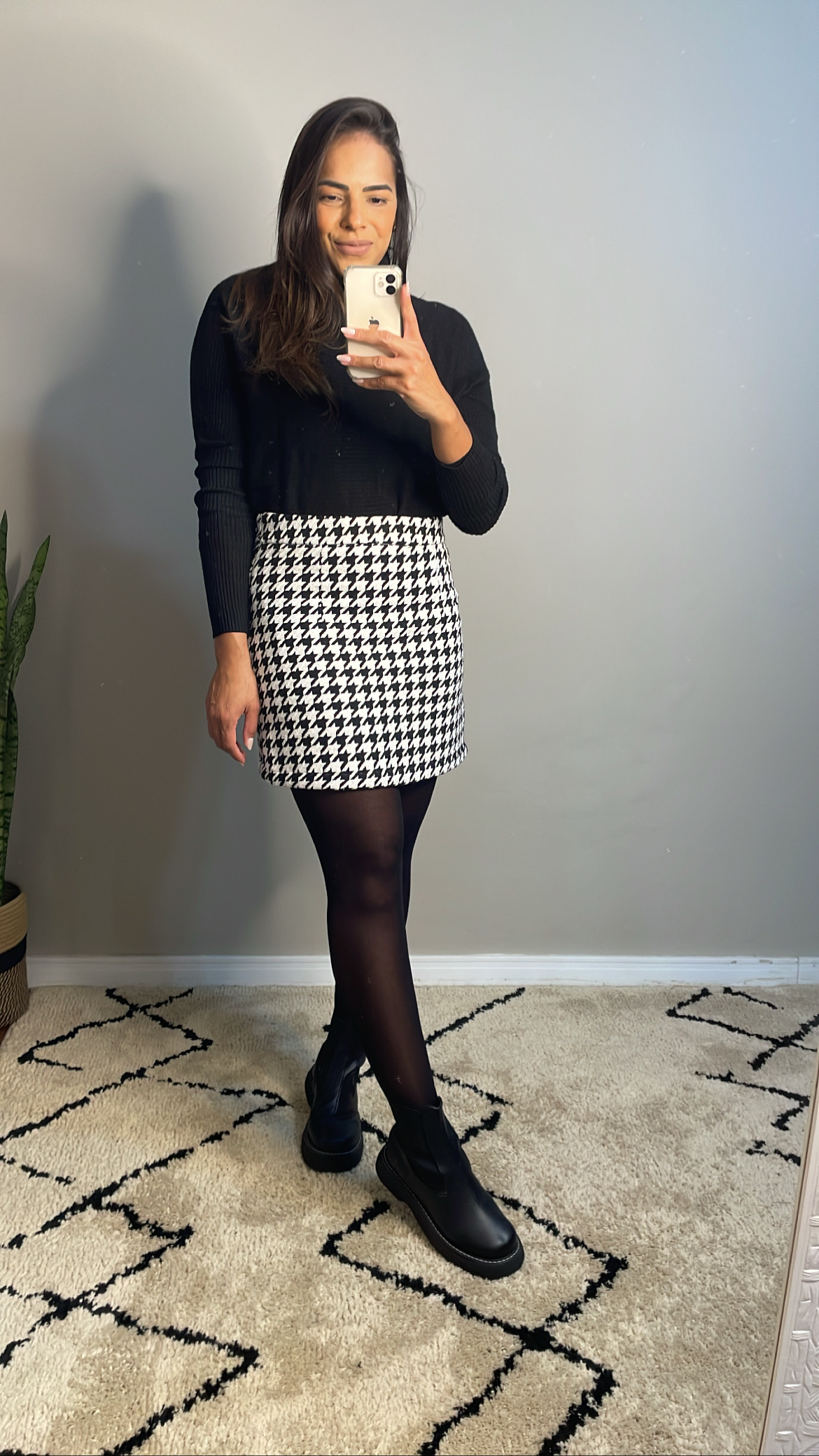 Saia em tweed estampa pied de poule, possui fechamento por zíper invisível e forro.
