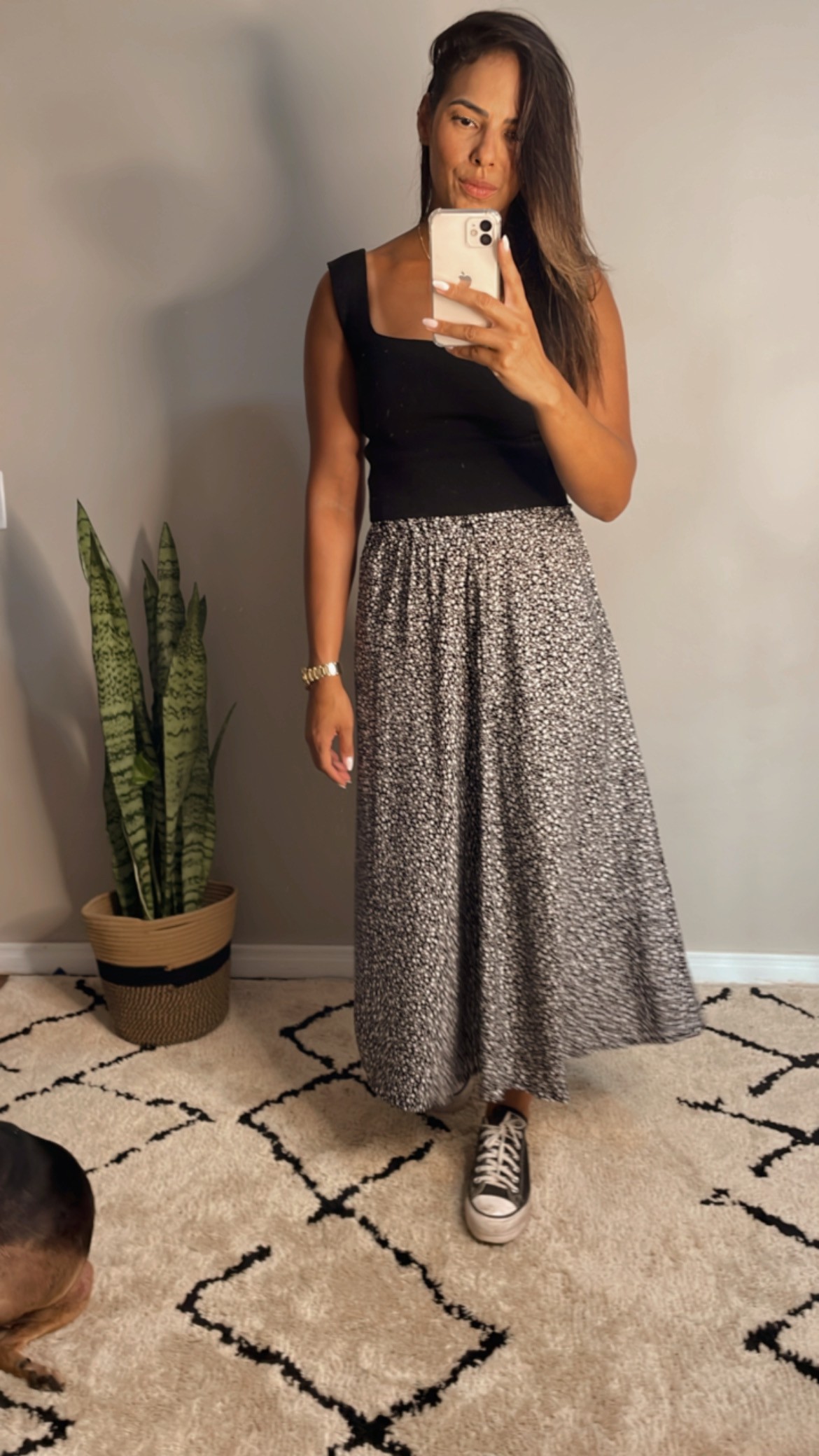 Saia em viscose, elástico na cintura, não possui fendas. Modelagem leve e fluida para usar com tênis, flat ou até mesmo com coturno no inverno.