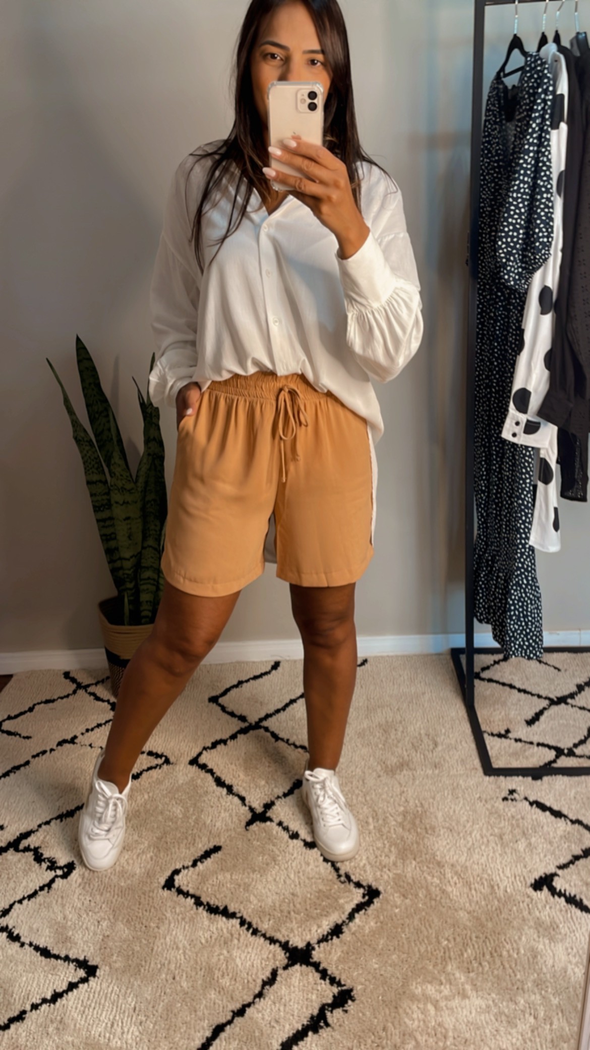 Nosso Shorts é feito em tecido de crepe alfaiataria, com elástico no cós e laço pra amarração, não é transparente.