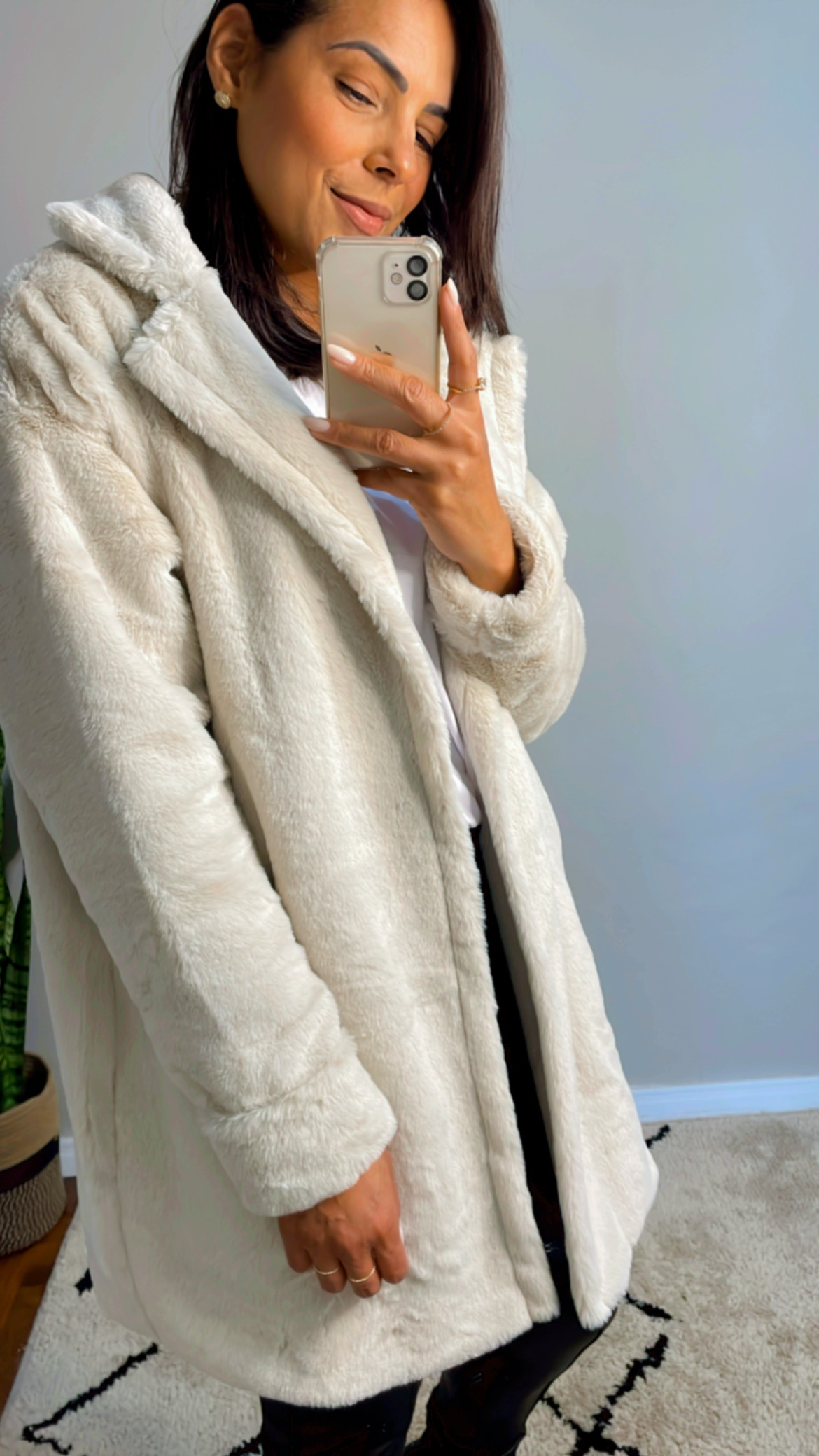Casaco sobretudo de pele fake bem macio, todo forrado de cetim por dentro (até nas mangas). Ele também tem acabamento em pele dentro da manga no punho para que você possa ajustar a manga. A modelagem do casaco sobretudo Ágata é única e veste do P ao G.